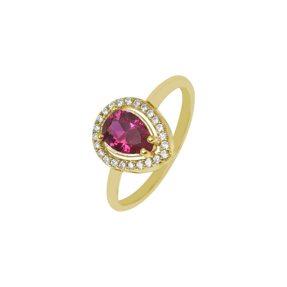 Δαχτυλίδι χρυσό 14Κ ροζέτα με κόκκινη οβάλ πέτρα και περιμετρικές λευκές πέτρες ζιργκόν σε 14 καράτια.