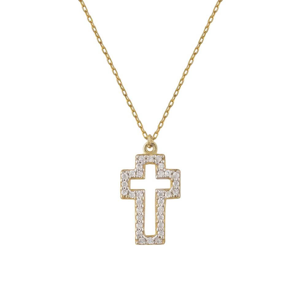 Χρυσό Κολιέ 14Κ Με Χρυσό Σταυρό Από Άσπρες Πέτρες Ζιργκόν Σε Τετράγωνο Μοντέρνο Σχέδιο απο την Χρυσή Γωνιά. Ένας μοναδικός σταυρός για κάθε περίσταση.